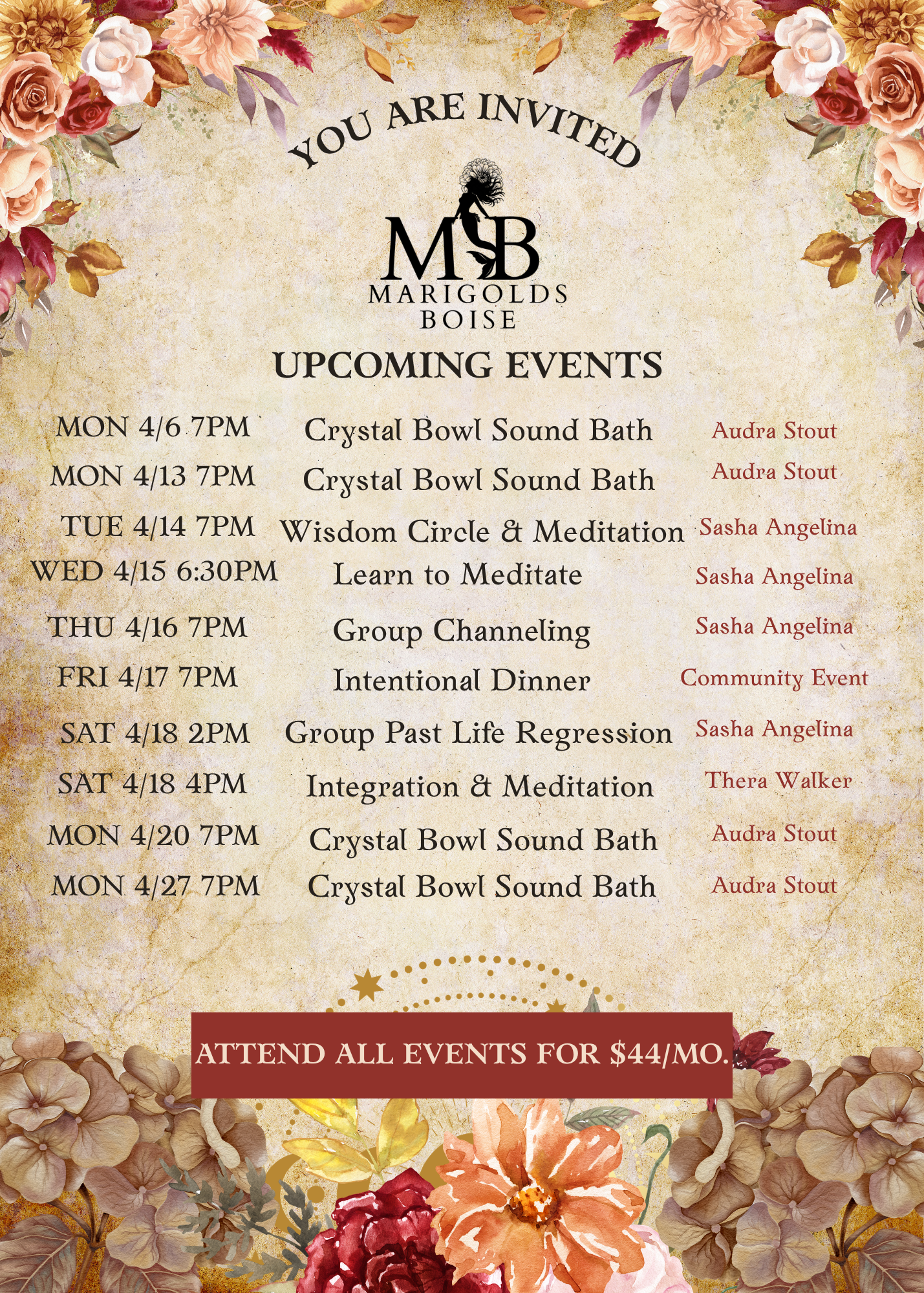 RSVP for events below. All events included in membership (except special event gatherings). Drop-in rates and donation-based available for some events.